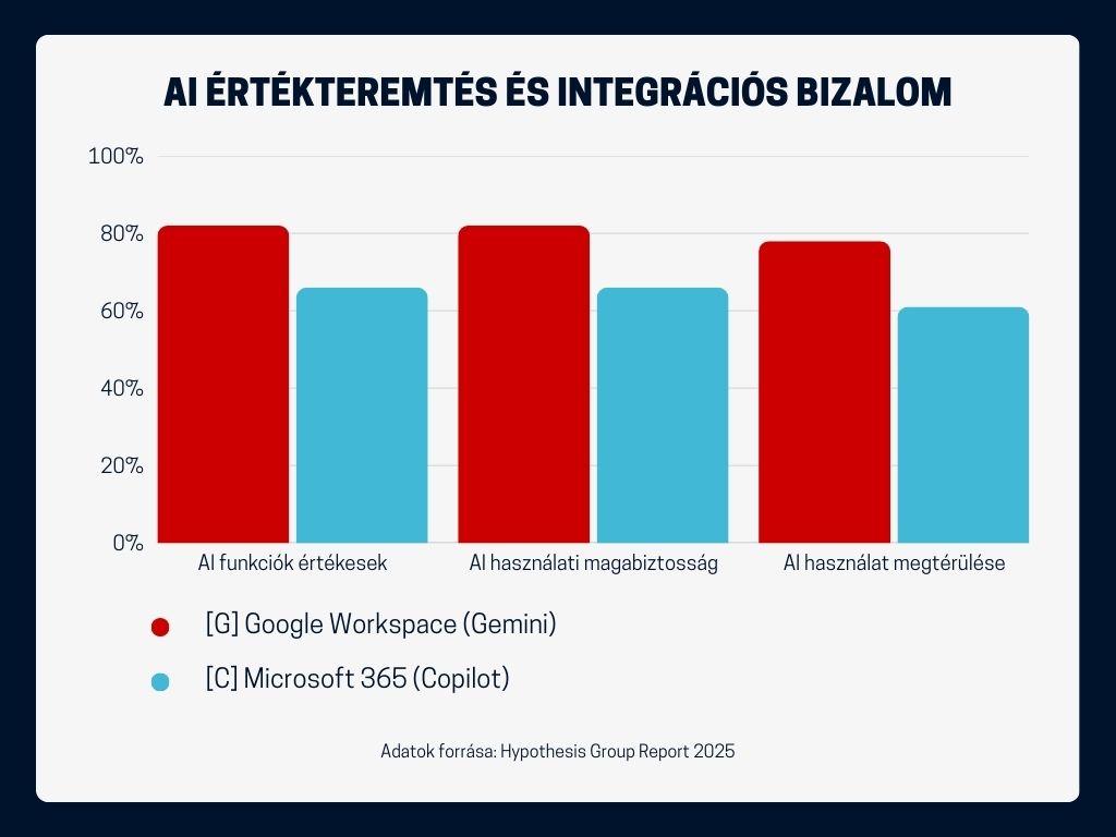 Míg a marketing mindkét oldalon erős, a felhasználói visszajelzések egyértelműek: a Google Workspace felhasználók 82%-a állítja, hogy az AI funkciók valós értéket teremtenek, míg a Microsoft 365 felhasználók közül ezt csak 66% látja így. Még szembetűnőbb a különbség, ha azt vizsgáljuk, mennyire érzik magukat magabiztosnak a dolgozók az AI használatában.