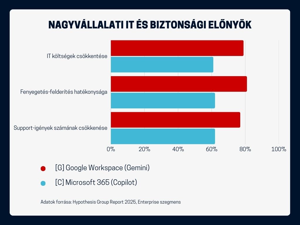 A nagyvállalati szektorban (1000+ fő) a Google Workspace még erősebben teljesít. A beépített fenyegetés-felderítés (threat intelligence) terén a Workspace felhasználók 81%-a elégedett, szemben a Microsoft 62%-ával – ez majdnem 20 százalékpontos különbség a Google javára.