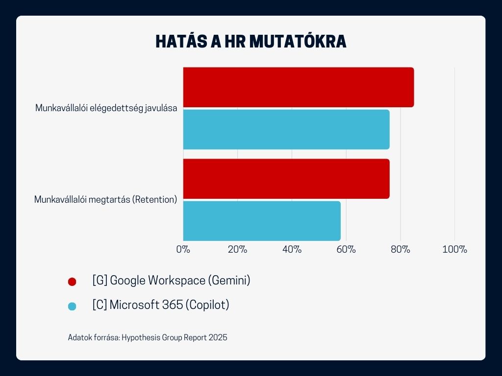 A Google Workspace-t használó cégek 76%-a szerint a szoftver javítja a munkaerő megtartását. Ezzel szemben a Microsoft 365-öt használóknál ez az arány mindössze 58%. Ez a 18 százalékpontos különbség kritikus lehet egy olyan munkaerőpiacon, ahol a tehetségek megtartása a legnagyobb kihívás.